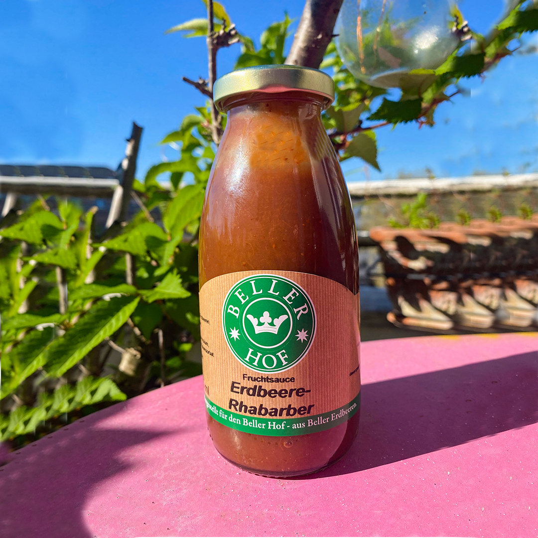 Extra für den Beller Hof aus eigenen Beller Erdbeeren mit Rhabarber hergestellt.